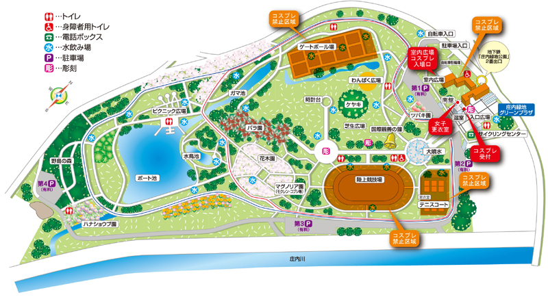 | その他 | 【当日撮影禁止場所】 ・庄内緑地グリーンプラザ内 ・ゲートボール場 ・陸上競技場 ・テニスコート ・サイクリングロード上 ・駐車場 オールジャンルコスプレ、一般、カメラマンOK ※男性、一眼以上のカメラを所持されている女性の方はカメラ登録必須 ※女装は禁止です 主催:公益財団法人みどりの協会 庄内緑地グリーンプラザ 運営協力:COSTAiL! |